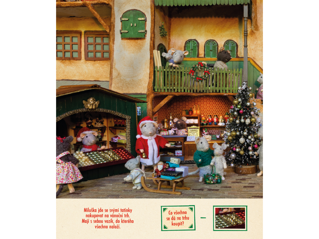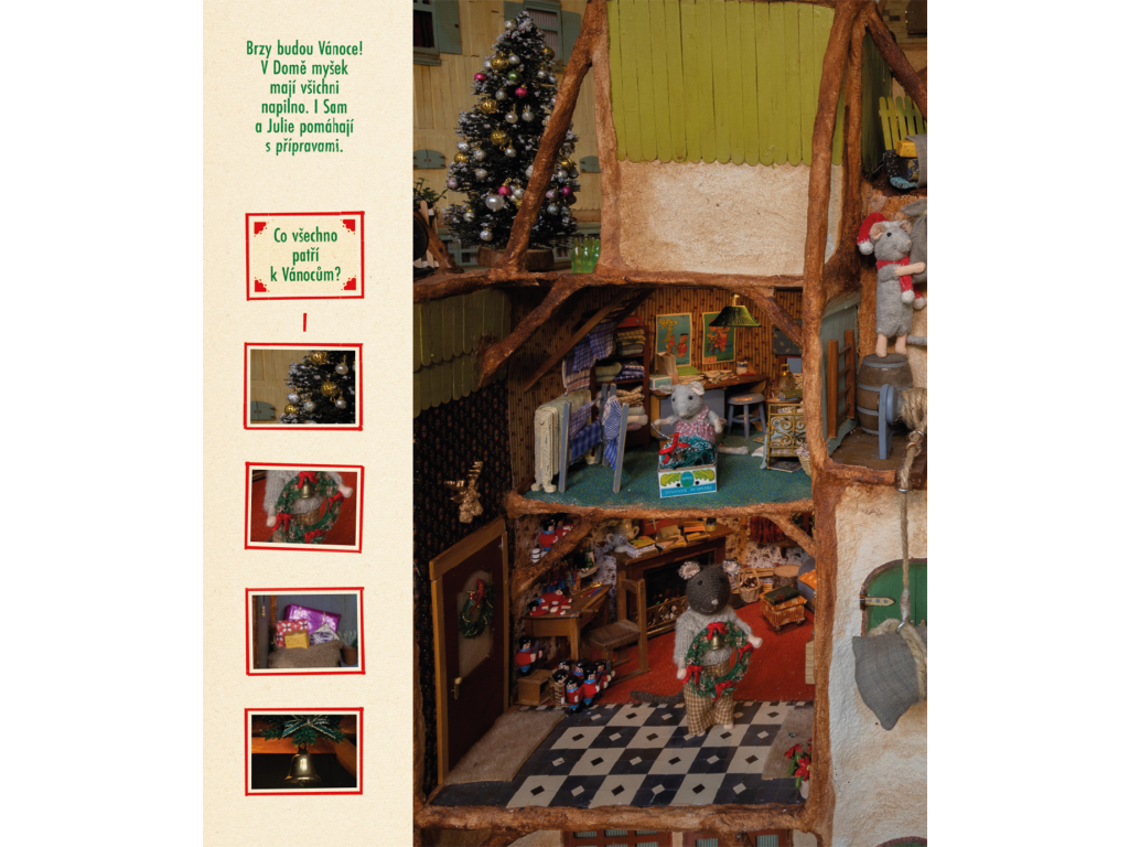 Pokračování velice populární knihy Hledej a najdi je ve znamení Vánoc. Spolu se Samem a Julií budete hledat ty nejmenší detaily v Domě myšek. V obchodech, dílnách, pokojích, kuchyních i venkovních prostorách se toho totiž dá hodně objevit. Stačí se jen dobře dívat! Najdete vánoční ozdoby, stromečky, čepice a ponožky?