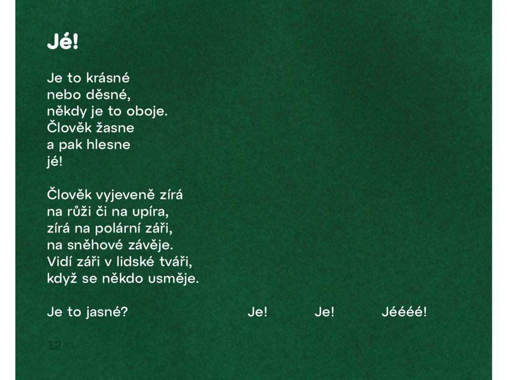 V nové knížce Daniely Fischerové Jé! najdete padesát básniček. Vystupují v nich strašidla, ufóni a další podivné příšery. Kráva jezdí tramvají, postel lítá, ještěři večeří, krtek krká, straka smrká a v lednici žvatlá roztomilé filé. Jsou tam šílené nápady, bláznivé vynálezy, drmoličky-slovní hříčky, rady do života a nakonec sedm ukolébavek, aby se nám pěkně spalo a zdály se nám dobrodružné sny.